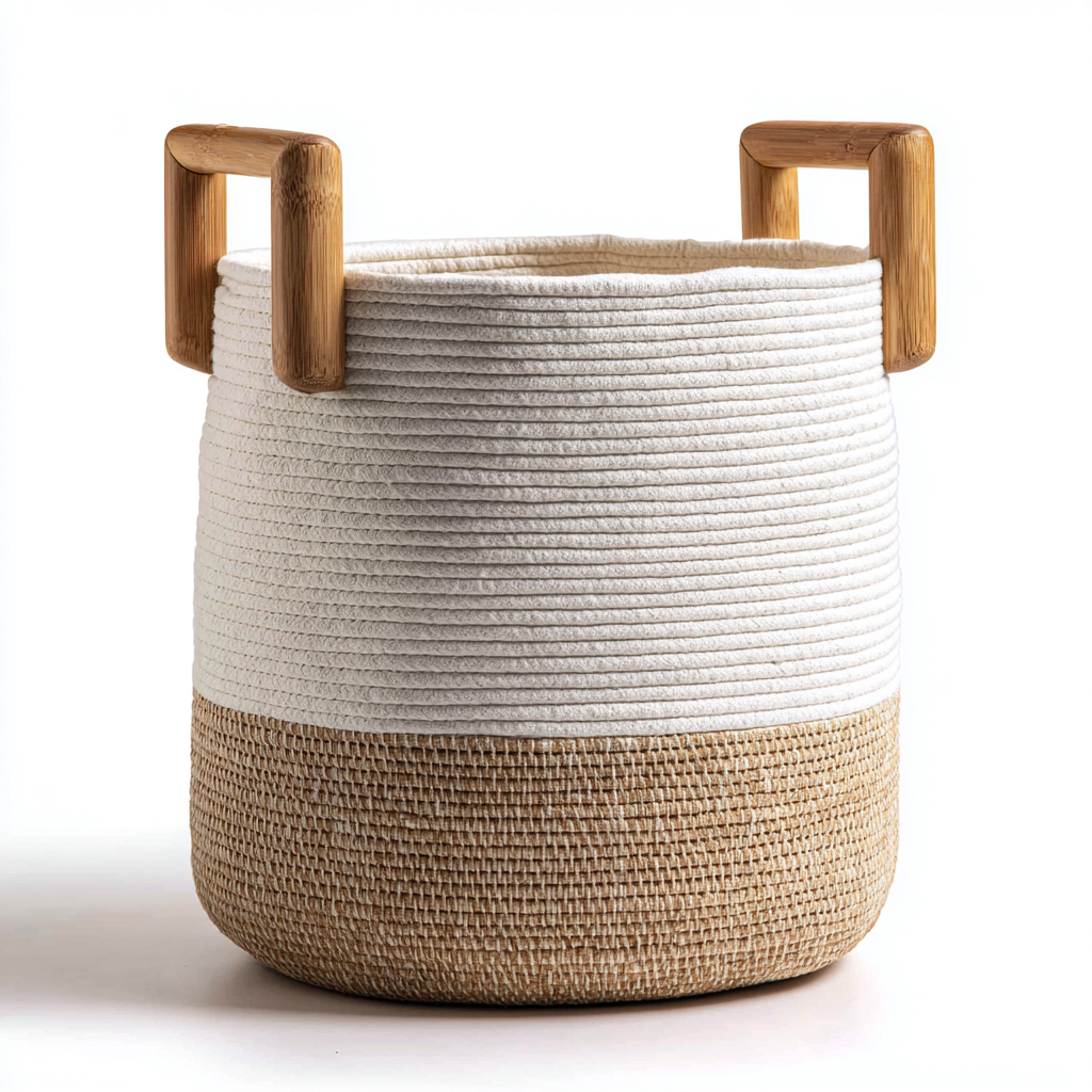 Der Korb besteht aus einer Kombination aus gewebtem Naturmaterial und gewickeltem Baumwollseil. Die beiden massiven Holzgriffe sorgen für eine stabile Handhabung und unterstreichen den natürlichen Charakter.