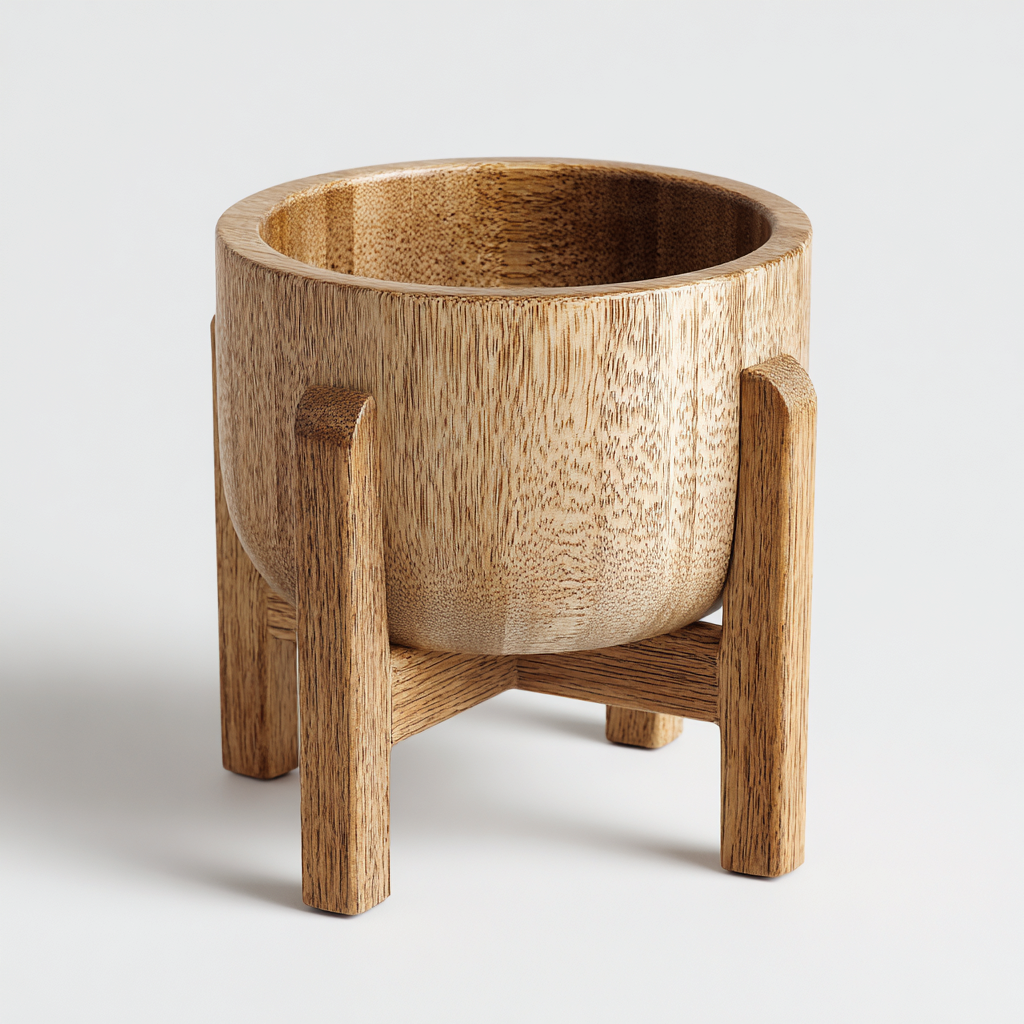 Der Topf sowie der Ständer bestehen vollständig aus hochwertigem Holz. Die feine Oberflächenstruktur und die stabile Konstruktion sorgen für eine langlebige Nutzung.