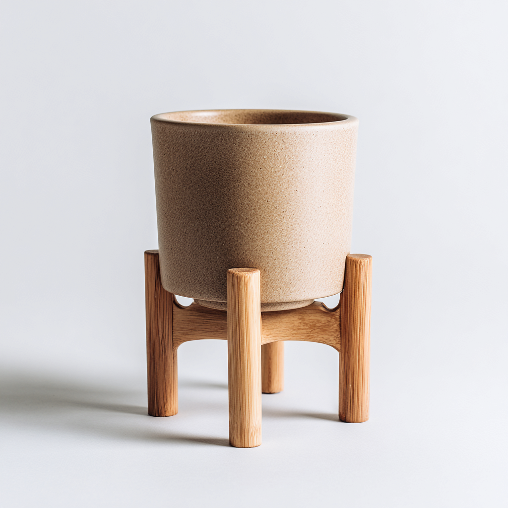 Der Topf besteht aus hochwertiger Keramik in matter Ausführung. Der stabile Ständer ist aus Holz gefertigt und sorgt für einen sicheren Stand sowie eine ansprechende Präsentation.
