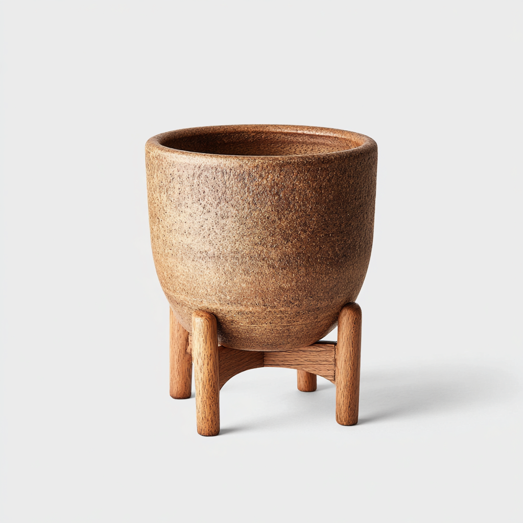 Das Gefäß besteht aus strukturierter Keramik mit erdiger Oberfläche, kombiniert mit einem robusten Holzständer für sicheren Stand.