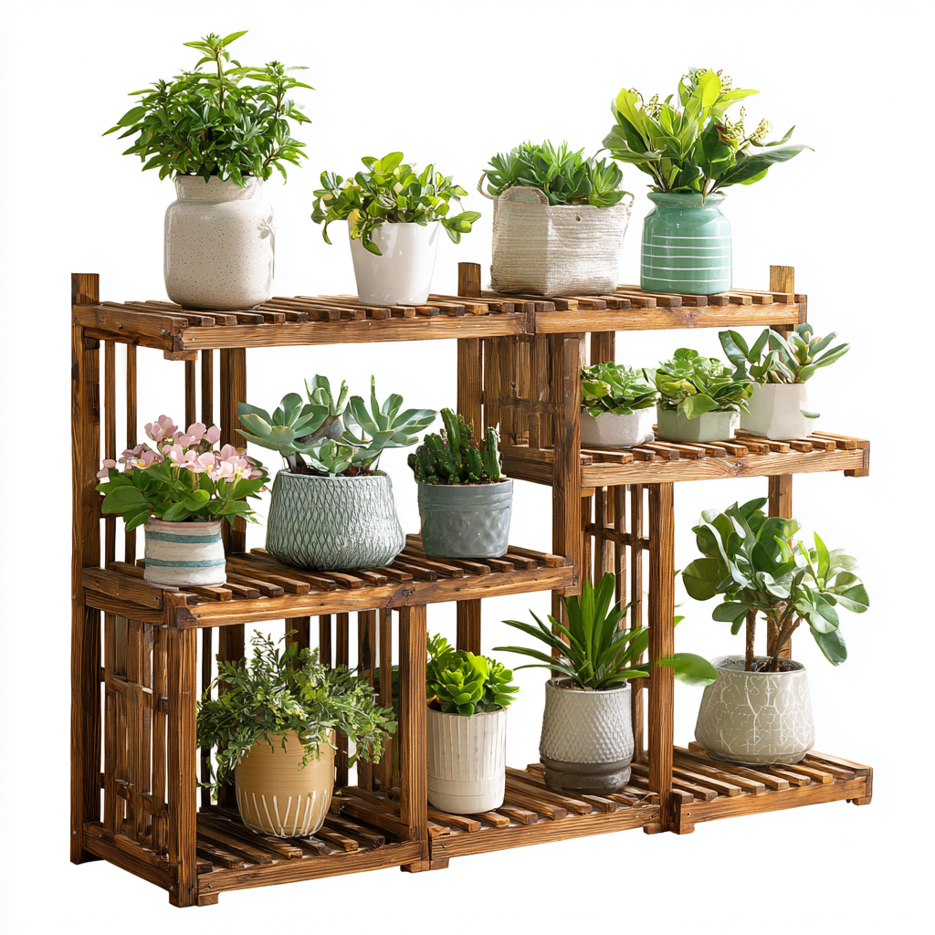 Dieses stabile Pflanzenregal aus Holz bietet mehrere Ebenen für eine dekorative und praktische Platzierung verschiedener Pflanzgefäße. Die offene Konstruktion sorgt für eine gute Luftzirkulation und eignet sich ideal für Innen- und Außenbereiche.