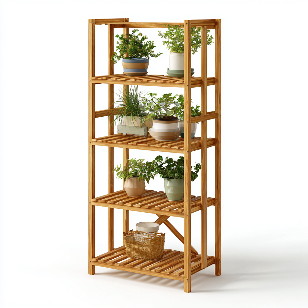 Dieses hohe Pflanzenregal aus Holz bietet vier Ebenen zur strukturierten und dekorativen Platzierung verschiedener Pflanzgefäße. Die offene Konstruktion sorgt für eine gute Luftzirkulation und ermöglicht eine vielseitige Nutzung im Innen- und Außenbereich.